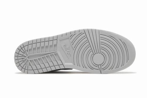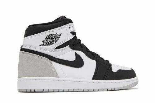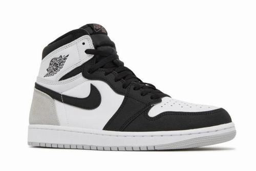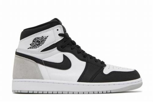 The Air Jordan 1 Retro High OG Stage Haze is a base sneaker in neutral shades. Its upper combines a white leather base with grey suede heel overlays and forefoot overlays in cracked black leather. Matching black accents feature a signature Swoosh and a vintage wing logo stamp on the lateral ankle. The woven cheap jordans on sale tongue is outlined in Bleached Coral, while the high-top sits on a rubber cup sole, with white sidewalls paired with a grey rubber outsole.