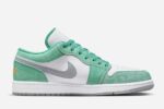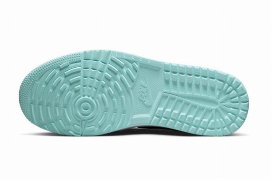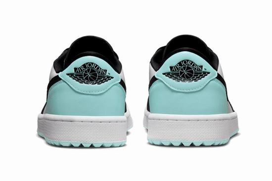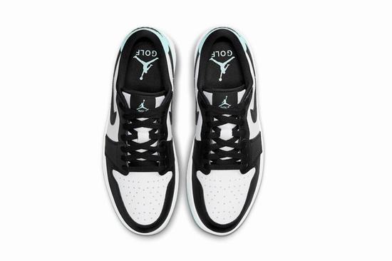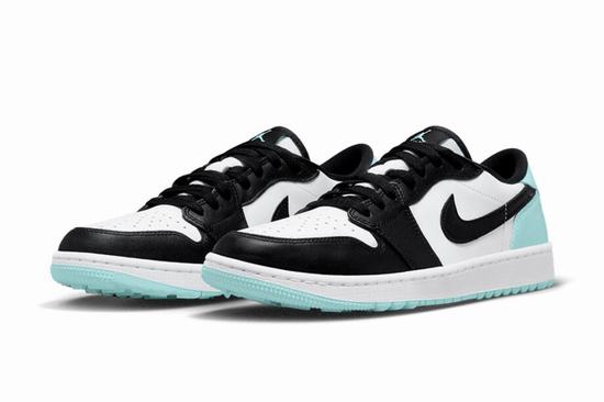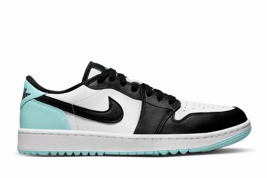 Air Jordan 1 Low Golf Copa adopts white leather as the base tone, combined with Black TOE color scheme. The heel and outsole are embellished with refreshing mint green, presenting striking color contrast effect. The tongue, insole, and outsole are decorated with Jumpman Golf designs to make a statement. The outsole grooves have been deepened to better suit golf, ensuring superior grip.