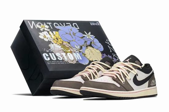 The Air Jordan 1 Reverse Mocha heel has an element of flying wings. The Swoosh upper on the side of the shoe is designed with a mixture of brown leather and beige lychee leather. The body of the shoe is mainly brown with two colors of beige toe cap. The lychee top layer is covered with the off white midsole and black outsole.