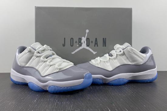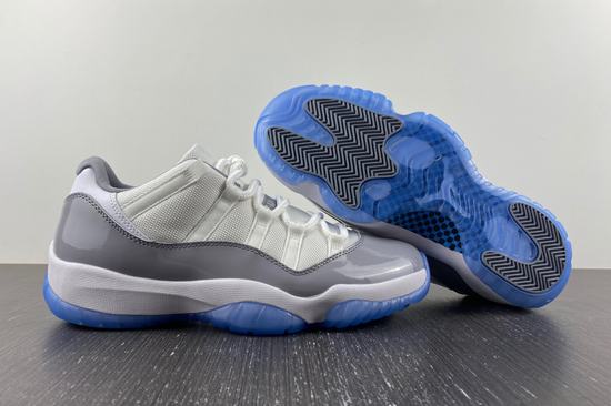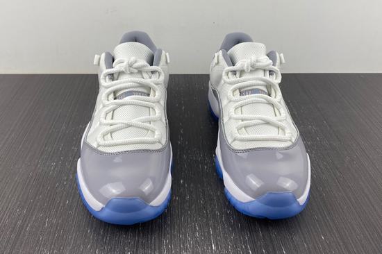 The shoes are displayed in white, college blue and cement grey. The Air Jordan 11 Low series is similar to the \’Cool Grey\’ series, with a white mesh upper, a leather heel, and a cement gray patent leather fender. The cheap retro jordan 11 University Blue Jumpman logo on the white midsole and snow and ice outsole perfectly illustrates this design.