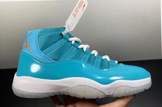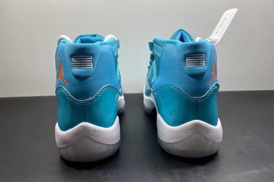 The Air Jordan 11 Miami Dolphins sample uses materials such as fabric, patent leather and leather, continuing the use of materials in the previous Air Jordan 11. The overall color scheme is mainly lake green, which is also the cheap jordan 11 retro main color scheme of the NFL Miami Dolphins jersey, and it also means the color scheme of the South Coast. The Jumpman Logo embroidery on the outside of the heel is decorated with orange, which is closer to the color of the Dolphins jersey. The outsole is made of transparent crystal material, supplemented by orange Jumpman Logo and lake green rubber decoration on the front and rear palms. Through the crystal bottom, you can see that the carbon plate of the Air Jordan 11 is really large, extending from the metatarsal area to the shoe.