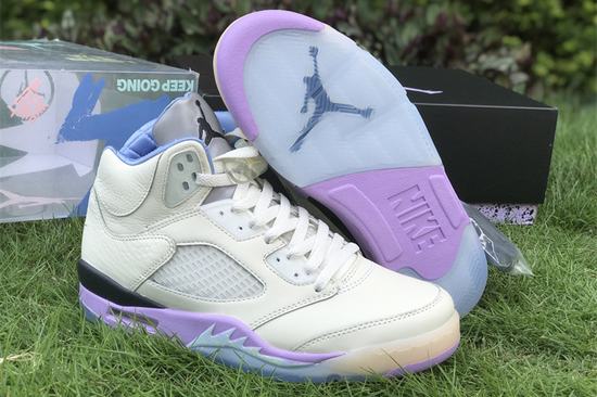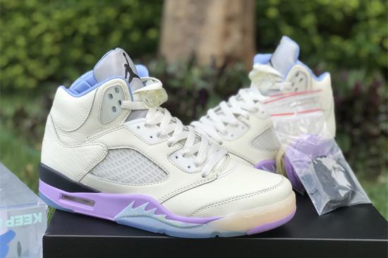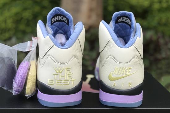 Air Jordan 5 X DJ Khaled We The Best Sail has an off-white leather upper with a purple midsole and a blue finish on The shark teeth section of The midsole. THE right foot is THE Swoosh design of THE first year, THE left heel is embroidered with WE THE BEST, THE three-dimensional uplift of THE upper is changed to leather stitching, a little cotton candy color feeling. THE crystal outsole shows THE \’WE THE BEST\’ and THE \’heel\’, THE inner lining is quilted and THE inverted label on THE inside of THE tongue has been changed to \’KEEP GOING\’. CRAZYCXFK shoes come from white and green label bubbles, THE left heel is embroidered with WE THE BEST, a little cotton candy color feeling.