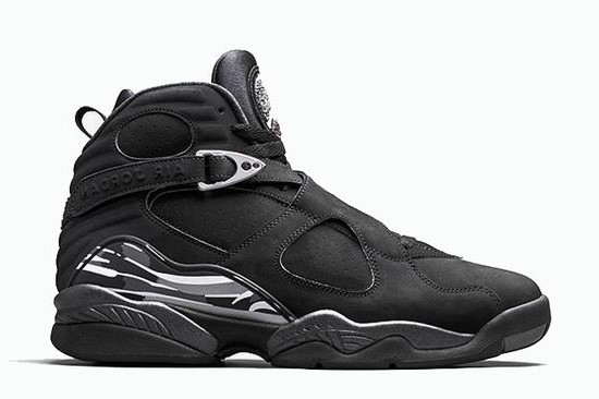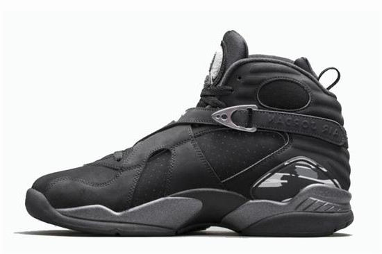 One of the first non-OG color schemes for the Air Jordan 8, the black and chrome AJ8 version reappeared. The shoes became a classic after they were first released in 2003. The Air Jordan 8 Chrome uses a black upper to incorporate chrome throughout the shoe style, subtly incorporating the Air Jordan 8 Playoff and Air Jordan 8 Aqua design concepts. Air Jordan 8 Chrome returns along with several other VIII collections (see Air Jordan\’s 2015 Vintage collection)