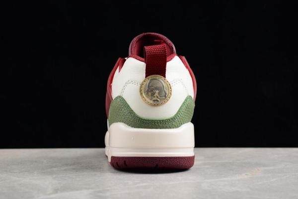 Jordan Spizike Low Year Of The Dragon takes Air Jordan 5 as the prototype, combines Air Jordan 3 middle sole and outsole, and is presented with familiar green explosion crack covering surface. The side of the shoe is supplemented by the eye piece of Air Jordan 4 and the stable logo details of the dark team red triangle, and the iconic hollow tongue of Air Jordan 6 is decorated with white LACES. Jordan Spizike Low Year Of The Dragon The base is white, which occupies most of the upper; On the toe and heel of the olive guard, the addition of dragon scale texture makes it more vibrant; A faint bluish hue surrounds the label and midshoe window; Dark red tones appear on the supporting \’wings\’, tongue, LACES lock and lining, and extend to the rubber outsole; The gold brand LOGO on the insole enhances the Spring Festival atmosphere and adds a touch of luxury color to the shoes. Other details evoke the dragon theme on the toes and heels, while the gold branding on the insole adds a touch of luxury and enhances the Chinese New Year celebration.
