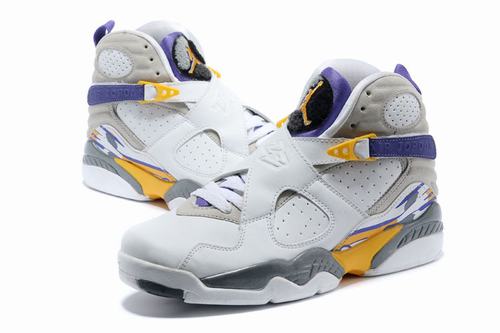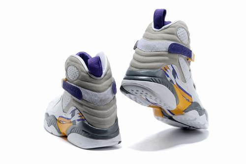 The pair of Air Jordan 8 has a white glossy finish with a light gray suede and a yellow-purple finish, and a black strap on the midsole, lining and upper straps.