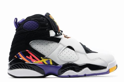 The pair of Air Jordan 8 has a white glossy finish with a light gray suede and a yellow-purple finish, and a black strap on the midsole, lining and upper straps.