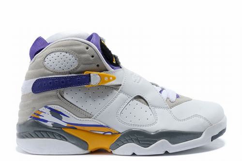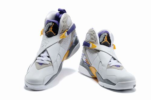 The pair of Air Jordan 8 has a white glossy finish with a light gray suede and a yellow-purple finish, and a black strap on the midsole, lining and upper straps.