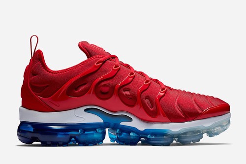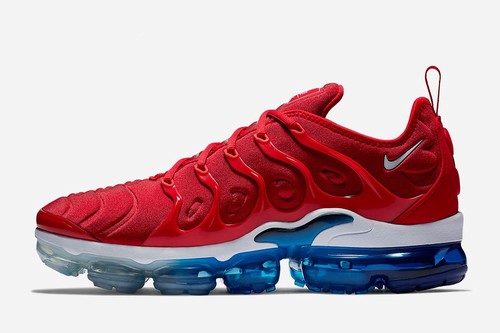 This pair of uppers are designed from the classic running shoes Air Max Plus, and the support system is changed to an independent bracket to bring greater stability. The midsole is an Air VaporMax full palm air cushion, which is covered with foam material, which solves the surging but stiff problem of Air VaporMax and brings a softer and thicker cushioning feeling. The new color scheme is a bright red upper with a white and blue sole, creating a dazzling and classic look.