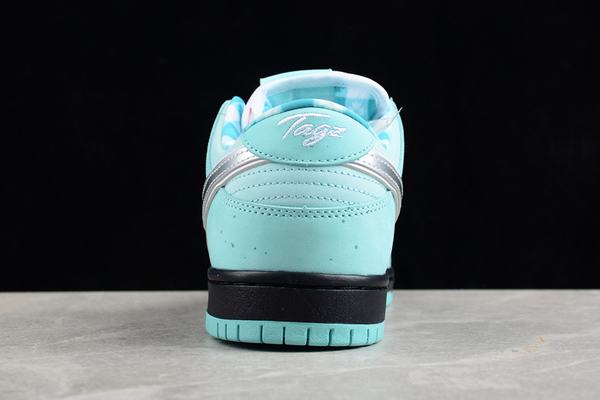 Custom designer tagzfootwear brought in a pair of overexpensive-looking \’lobsters\’ called Dunk SB. The upper has been changed to a very recognizable blue, and the inner lining is also in the same color. The toe position retains the classic binding design elements of the lobster series. Another eye-catching change is that the Swoosh is presented in metallic silver, giving the shoes a more luxurious look. For this purpose, a blue shoebox was specially customized to keep in line with the packaging of jewelry. The heel embroidery shows that this pair of \’lobsters\’ was created by tagzfootwear, a sneaker customiser. The props used for the shoot also fit the theme very well. In terms of design, this double name chooses SB Dunk as the prototype, through the classic blue as the main color, and with white decoration, the overall is very fresh temperament. Both sides of the upper and tongue are made of mesh, which combines with blue suede and white leather on the toe to give a different texture.