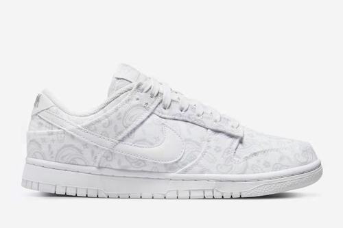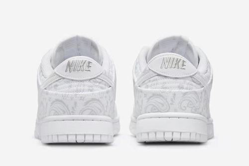 Born in 1985, the Dunk went viral with its unique preppy colorway, set off a fashion trend, and eventually swept the world as an enduring classic. The Dunk Low \’White Paisley\’ features a canvas upper with a white paisley pattern covering the entire upper for an alluring appeal, and modern shoemaking technology for a comfortable foot feel. On the Swoosh logo on both sides of the shoe body, the leather material is still used, and the simple white is very consistent with this theme. Afterwards, a light gray finish is added to the tongue embroidered logo and the NIKE position on the heel. Finally, the white midsole and outsole complete the overall design.