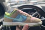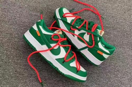 The white and green color scheme is called Dunk Low \’Team Green\’, which is dominated by retro-style white and green, and the overall effect is very similar to the 0-W x Dunk Low green model. Iconic elements such as the instruction manual design on the inside of the shoe body and the orange label on the outside Swoosh Logo represent its joint identity. A white midsole and green outsole contrast with the body of the shoe. The effect of violet light on the tongue.