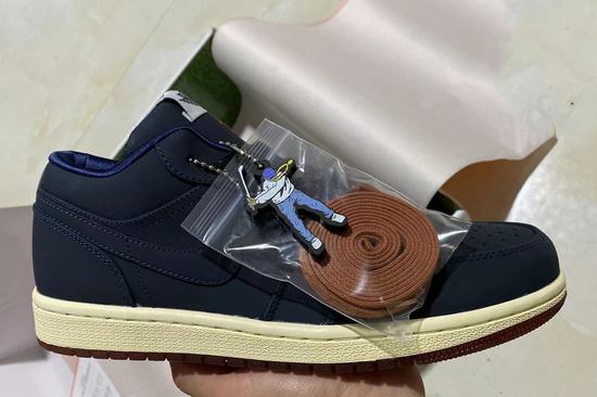 The entire pair of Eastside Golf x Air Jordan 1 Low shoes uses dark blue as the main color. The material is made of suede and satin lining stitching, and the Eastside Golf brand is marked with embroidery on the tongue. There are also Eastside Golf\’s brand and character logo on the heel of the shoe, and there are trapeze elements on the shoelace head. At the same time, the mandarin duck design is also integrated into the insole, and the visual effect is very outstanding.