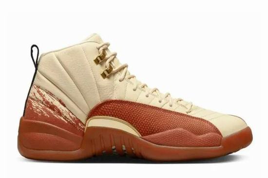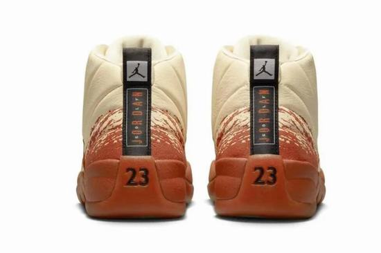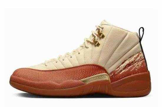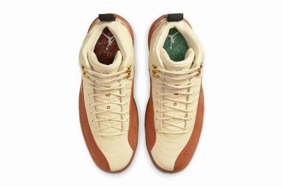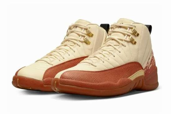 The whole Eastside Golf x Air Jordan 12 Low Golf shoe body is presented in cream and light brown. The two iconic leather pieces of the Air Jordan 12 are very similar to the texture of the red earth, and also simulate the effect of mud splashing in the heel. In addition, the image of Eastside Golf\’s classic gold chain, jeans and sneakers are used on the tongue and the attached tag. The insole and transparent outsole are also full of details, with grass and red mud patterns printed on them.