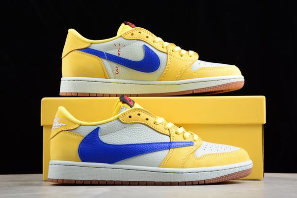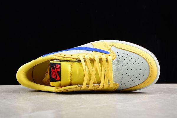 Travis Scott x Air Jordan I(1) Low OG Canary uses the main color of yellow, which is preferred by Travis Scott, and the side Swoosh is shown in blue. The color scheme was inspired by Travis Scott\’s Alma mater, Elkins High School, and the overall look is quite eye-catching. Large area of yellow + white leather stitching, Swoosh is presented in a conspicuous blue, and finally finished with raw rubber outsole, wear resistance +1. The Cactus Jack and tongue tags on the inside of the shoe are embellished in red, and the embroidery on the heel has been confirmed to be white, in addition to the red, blue and yellow LACES can be freely matched. The joint name is equipped with three pairs of shoelaces in yellow, red and blue, for everyone to match freely. Finally, the white midsole and brown outsole finish, perfect the whole shoe design.