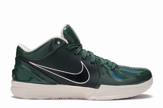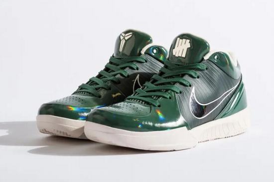 Undefeated x Kobe 4 Protro \’Fir\’ was launched in August 2019 as part of a four-piece collaboration to celebrate Mamba Day. The shoes come in a dark green design, with an upper made of patent leather mixed with a synthetic material incorporated into Flywire, all mounted on an off-white midsole. Unique brand highlights include the Undefeated logo printed on the heel and the retailer\’s Five Blows logo located at the top of the left tongue.