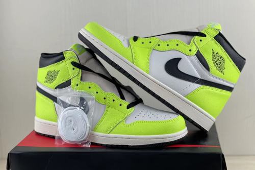 Air Jordan 1 Fluorescent green this color is not rare in the use of sneakers, but due to the difficulty of driving it leads to the polarization of the evaluation of this color, the Air Jordan 1 High OG Volt shoe body overall only black, white, fluorescent green three colors, The insole also uses the fluorescent green match color of coquettish gas, and the leather that upper material chooses to have special grain material, increased the texture of whole pair of shoes.