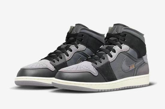 The Retro Air Jordan 1 Mid Inside Out gives a classic look a new look with a unique layering design and exposed foam mouth. The body and uppers are splicing in dark grey, with the Jumpman Logo on the tongue and the wing on the heel embellished with silver stitching, and the toe covered with a black leather frame and dark grey suede. At the same time, combined with the old sole, shape the appearance. The Swoosh on the side of the shoe has orange stitching outlining the \’two and three\’ style, which adds eye-catching details to the shoe style.