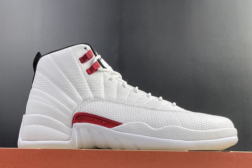 Air Jordan 12 Twist with white, red and black, white leather, and decorated with tongue, laces, mudguards and midsole. Silver decorative eyelets, black decorative tongue trademark and heel pull tongue, and equipped with white cheap jordans for sale rubber outsole, simple and generous.