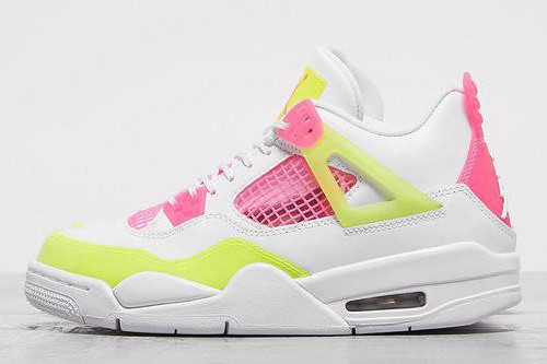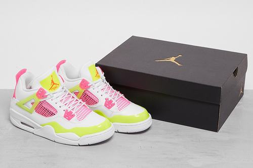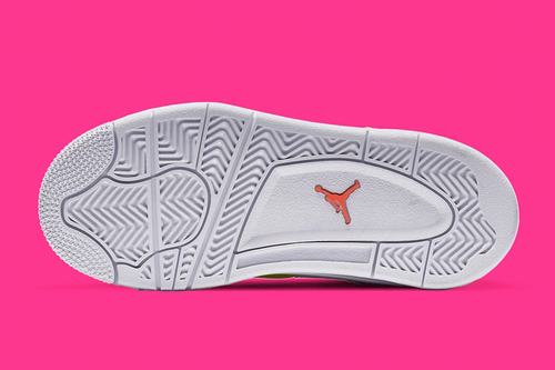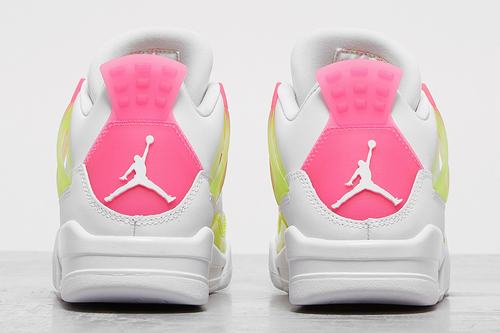 The Jumpman logo on the tongue and heel of the Air Jordan 4 GS Lemon Venom shoe is pink and white, respectively, while the \’Air Jordan\’ logo on the back of the tongue is inverted, with each letter in two colors. The midsole is still a classic white design, and the outsole is emblazoned with the Coral Jumpman Logo.