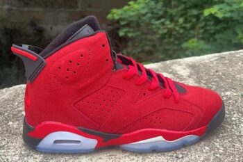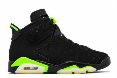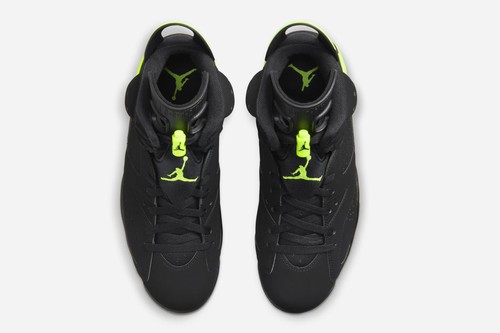 The Retro Air Jordan 6 Electric Green upper uses a black nubuck leather structure, reminiscent of the 2018 Oregon PE, the shoelace buckle, heel pull loop and tongue Jumpman brand logo on the Electric Green design highlights this point. Under the foot, the polyurethane midsole uses more electric green, which is used in conjunction with the visible air on the heel to provide cushioning. The luminous finish on the translucent rubber outsole completes the look.