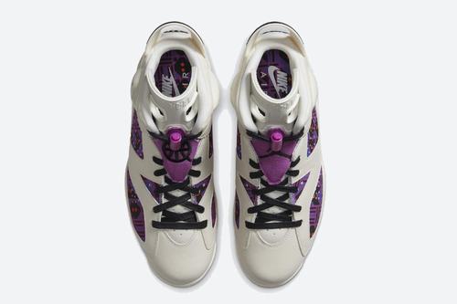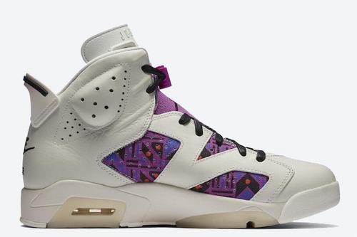 The second colorway upper of the air jordan 6 Quai 54 alternates between elegance and magnificence, combining a soft sail leather construction with a bright print on the outside and inside of the quarter. Due to the mix of purple, blue, orange and brown, this print is essentially a color offset from the graphics used by the other air jordan 6 and air jordan 1 low in the series. The left shoe retains the standard Jumpman brand cover on the tongue, while the air hits the heel, while the right shoe replaces both with Quai 54 graphics.
