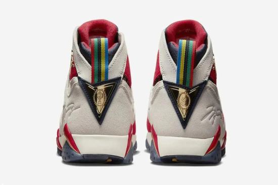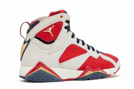 The strap on the heel of the Trophy Room x Air Jordan 7 shoes adopts the color of the Olympic rings, and is connected with the gold medal printed with Jordan\’s jersey number 9 and the logo of the Trophy Room store, which is a metaphor for the gold medal won by Jordan for the Dream Team at the Barcelona Olympic Games in 1992. There are also many small details on the insole, including the logo of the flying man and the logo of the Trophy Room, to show the joint identity. In addition, this shoe also includes three laces of different colors for you to match. There are many small details on the shoebox, which is full of sincerity.