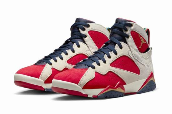 The strap on the heel of the Trophy Room x Air Jordan 7 shoes adopts the color of the Olympic rings, and is connected with the gold medal printed with Jordan\’s jersey number 9 and the logo of the Trophy Room store, which is a metaphor for the gold medal won by Jordan for the Dream Team at the Barcelona Olympic Games in 1992. There are also many small details on the insole, including the logo of the flying man and the logo of the Trophy Room, to show the joint identity. In addition, this shoe also includes three laces of different colors for you to match. There are many small details on the shoebox, which is full of sincerity.