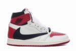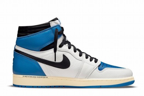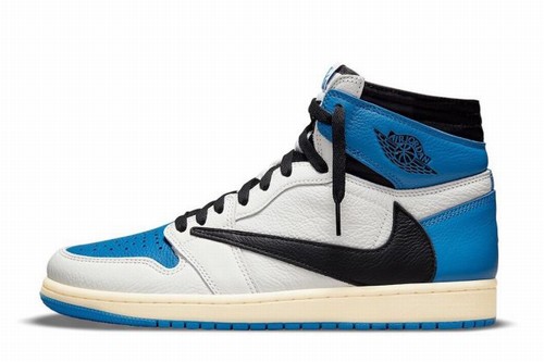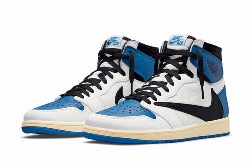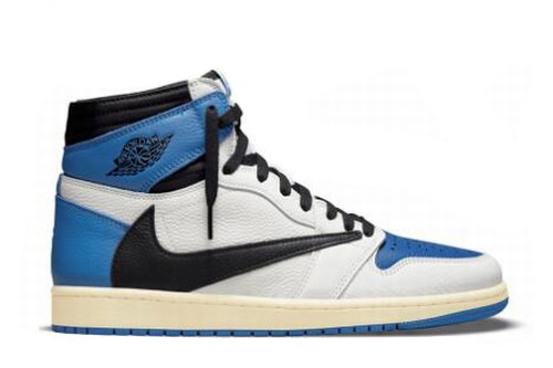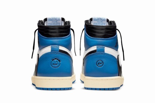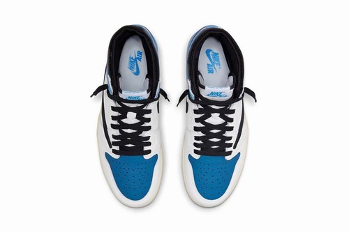 TS x Fragment x Air Jordan 1 High uses white tumbled leather distributed on the midfoot, forefoot and nylon tongue to form the upper, and adds the blue color \’Military Blue\’ represented by the fragment design to the toe, ankle flaps and heel And so on, and Travis Scott’s symbolic designs \’Barb\’ and \’Cactus Jack\’, \’fragment design\’ and Air Jordan and other logos have chosen to be supplemented with black embellishment to fully demonstrate their respective identities.
