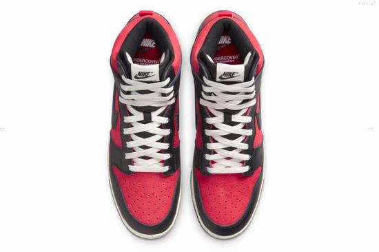 Undercover principal Jun Takahashi (Takahashi Jun) created a unique colorway for this Dunk High 1985, paying homage to classic basketball with the original design, while echoing the legendary style of Undercover\’s latest clothing line. The fit inherits the shape of the 1985 original, enhanced with Takahashi\’s fine craftsmanship and design sensibility. The Dunk High 1985 x UNDERCOVER takes the look and feel of the 1985 Dunk shoe, while injecting craftsmanship and creativity. The shoe\’s upper features black leather and red nubuck for a contrasting effect that showcases classic basketball tones as well as Undercover\’s favorite colorway, including a splashed midsole. Finally, the heel counter bears the \’Undercover Basketball Association\’ logo, which not only highlights the Dunk High 1985\’s original basketball performance design, but also symbolizes the new page in history written by being selected as the designated shoe of the virtual Undercover basketball league.